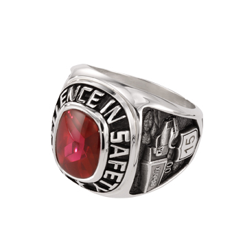 This sterling silver men's safe driving ring features a ruby center stone. A truck is cast into the side of the ring and an engraved number denotes the recipient's years of service.