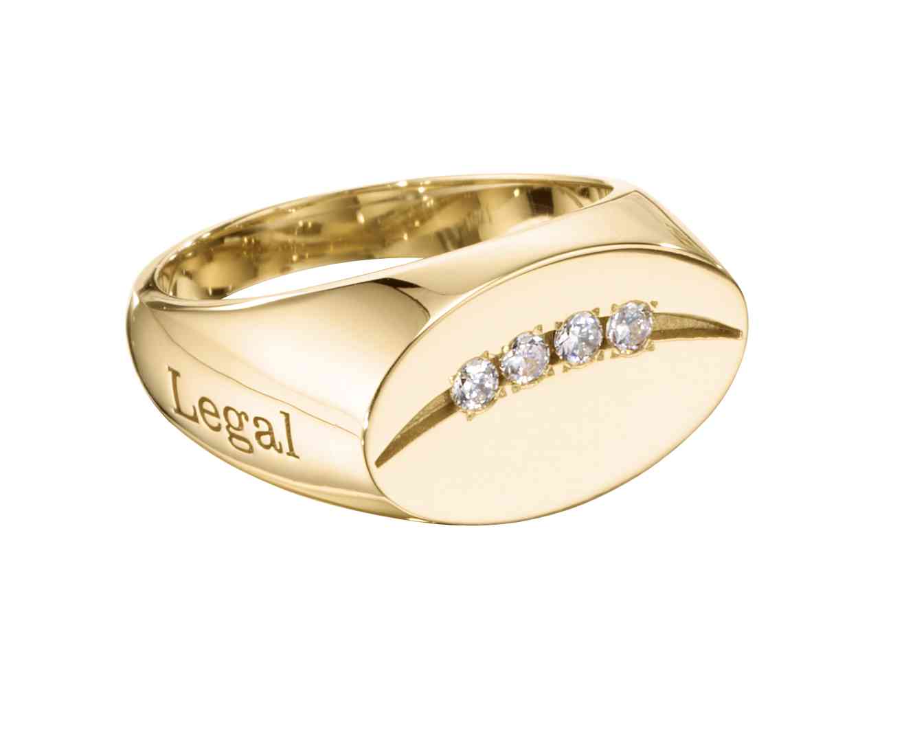 Four diamonds are set along a gentle curve that cuts across this 14 karat gold women's signet award ring. The company name is engraved into the side of the ring.