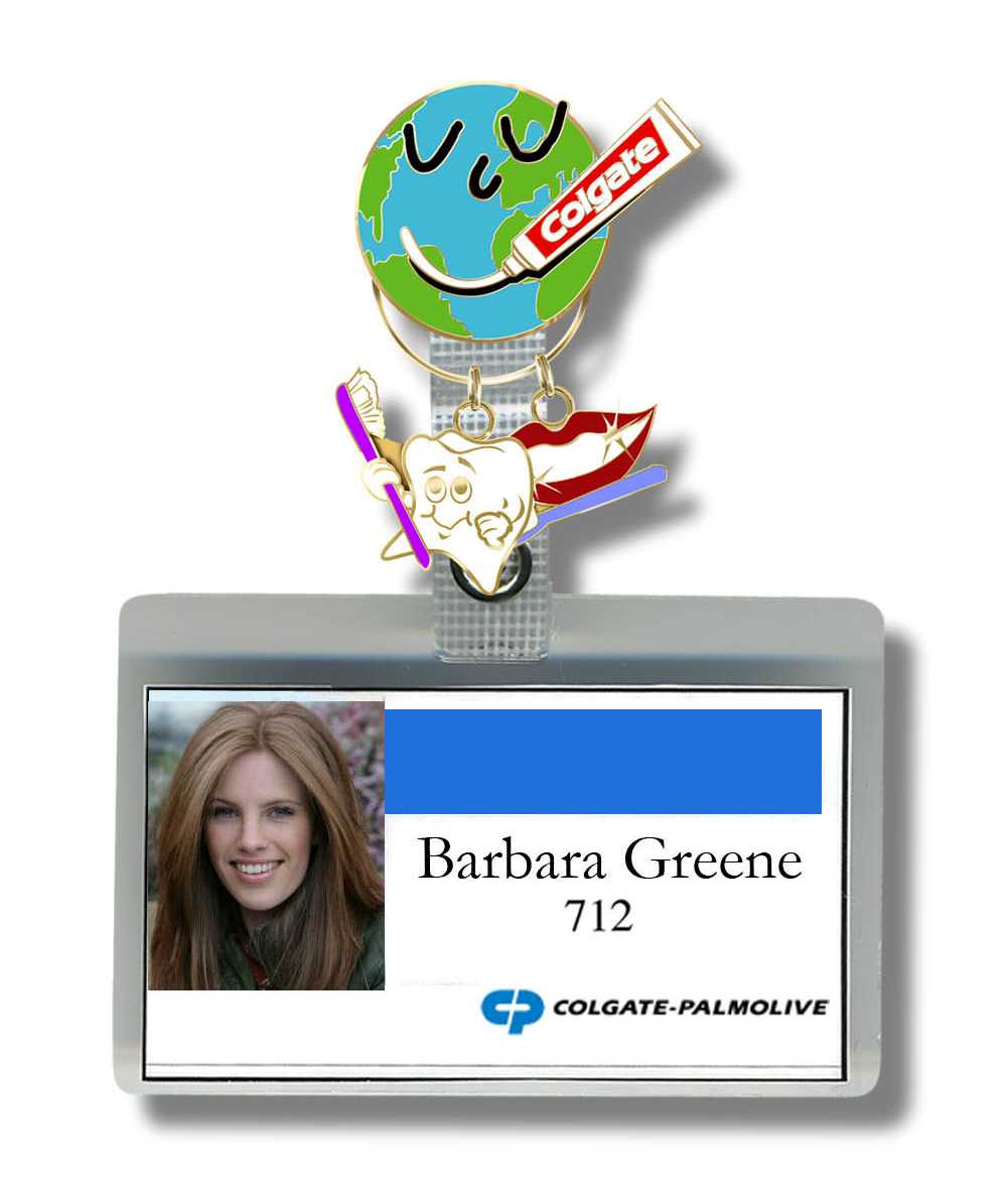 This whimisical globe smiling badge holder emblem not only is great brand awareness for Colgate, but allows for add-on charms to be added to recognize various corporate goals met.