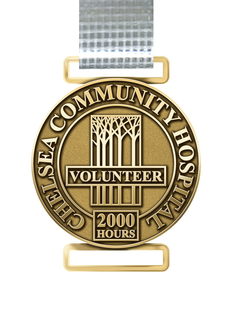 An antique finish offsets the raised and polished gold text and logo on this elegant custom hospital volunteer badge holder emblem that includes recognition of the thousands of hours served.