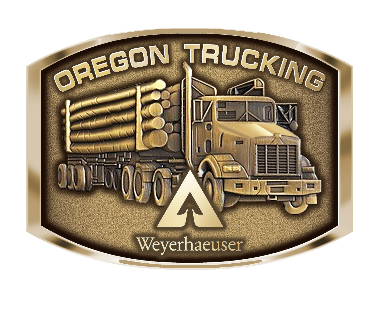 This one-of-a-kind custom antiqued gold belt buckle promoting Weyerhaeuser's Oregon Logging Truckers and is a coveted piece among their drivers.