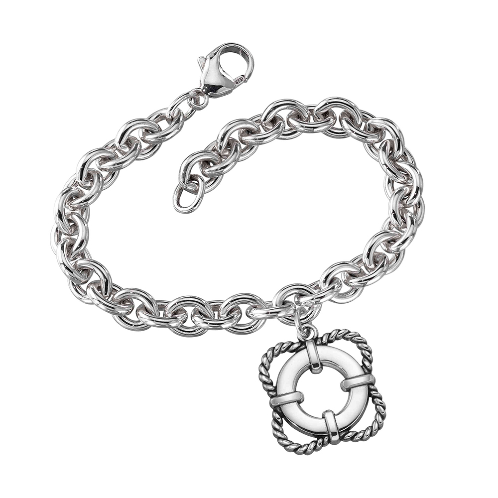 A nautical themed custom modeled sterling lifesaver charm attaches to a sterling silver link bracelet with lobster claw clasp.