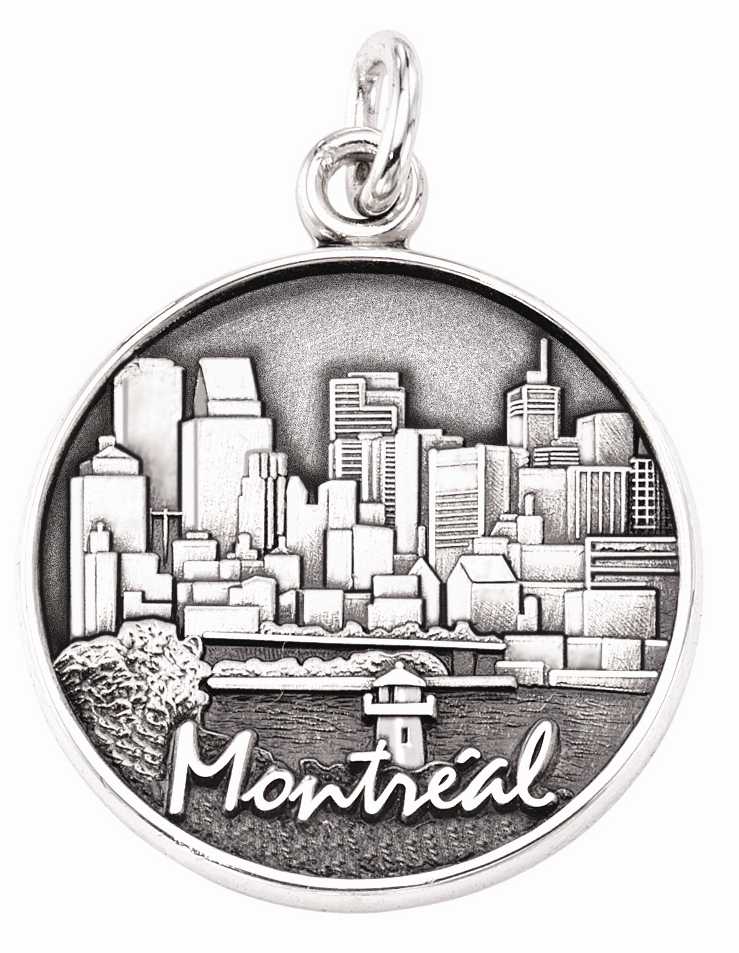 The beautiful skyline of Montreal Canada is modeled into this custom sterling silver sandblast and polished trip charm. With trip details and dates on the back, it is a truly one-of-a-kind keepsake.