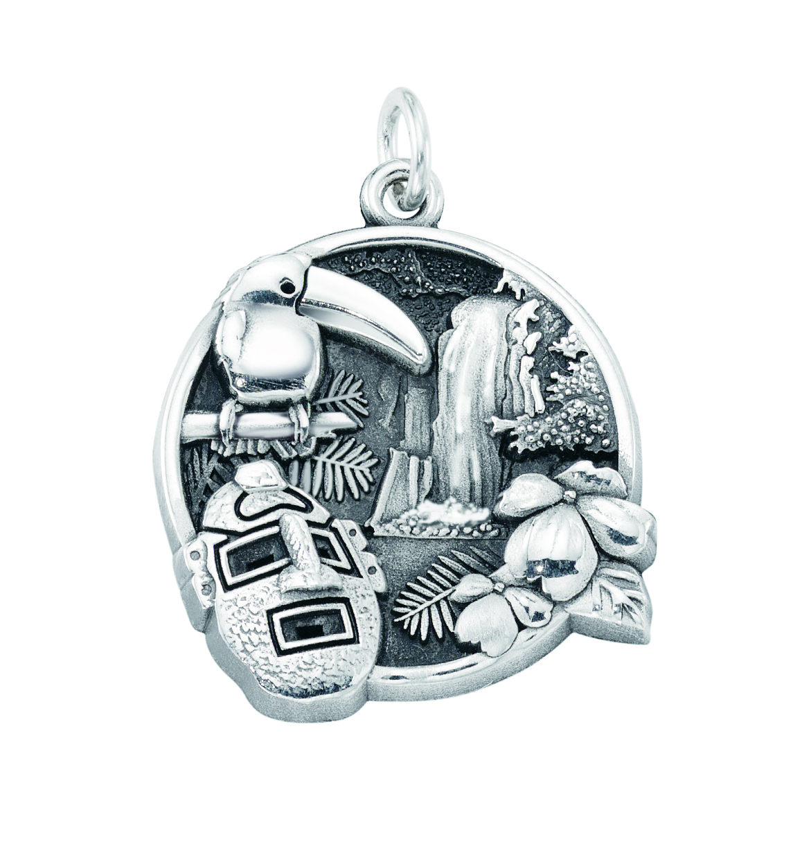 Central America jungle icons adorn this custom sterling silver sandblast and polished trip charm for Costa Rica. Event details and dates are engraved on the back.