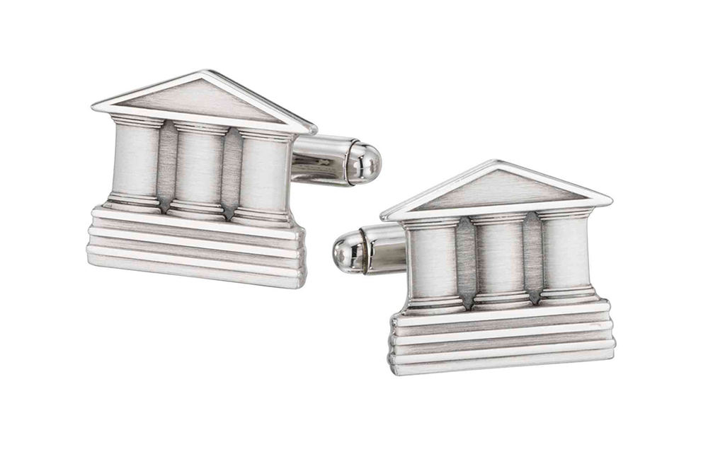Stable and sturdy greek columns hold up these custom brushed silver cufflinks. Given as years of service awards for a financial institution's long term employees.