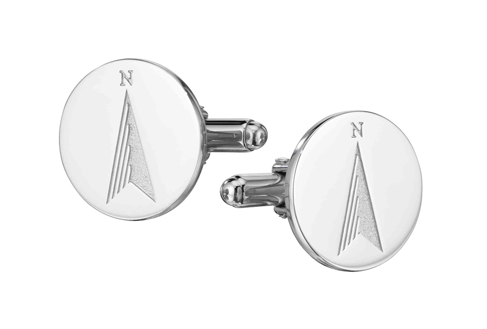 This north pointing logo is laser engraved into these high polished custom sterling silver cufflinks. Company message is engraved on the back.