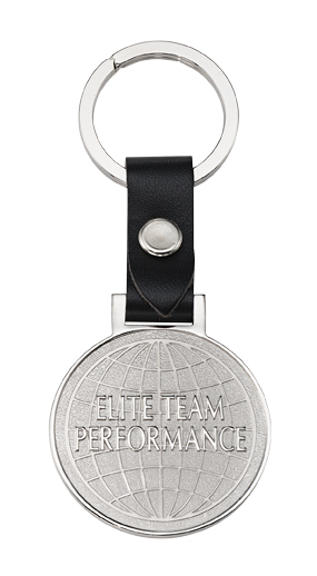 This custom silver and leather sandblast and polished keytag recognizes "Elite Team Performance" on a silver gold background
