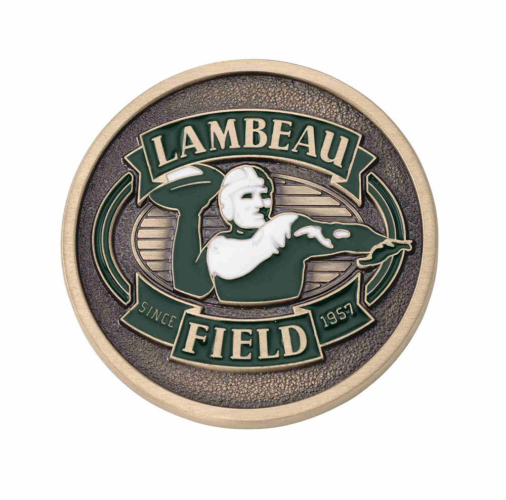 Home to the Greenbay Packers NFL team, this custom gold antiqued coin commemorates historic Lambeau Field and the many great athletes that have played there.
