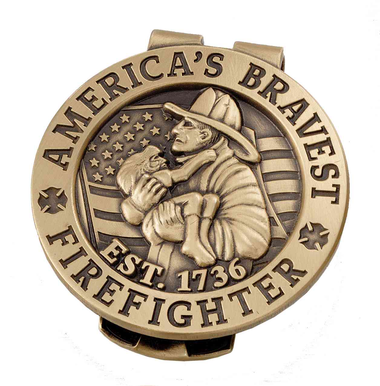 A firefighter and child are modeled into the middle of this custom antique gold finished money clip. A great way to honor the brave firefighter in your life.