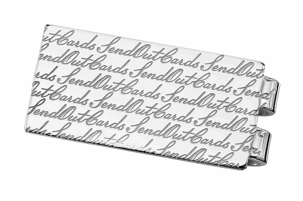 The step and repeat pattern of the Send Out Cards logo gives this custom sterling silver money clip a modern yet sophiticated look. Part of Send Out Cards consultant recognition award items.