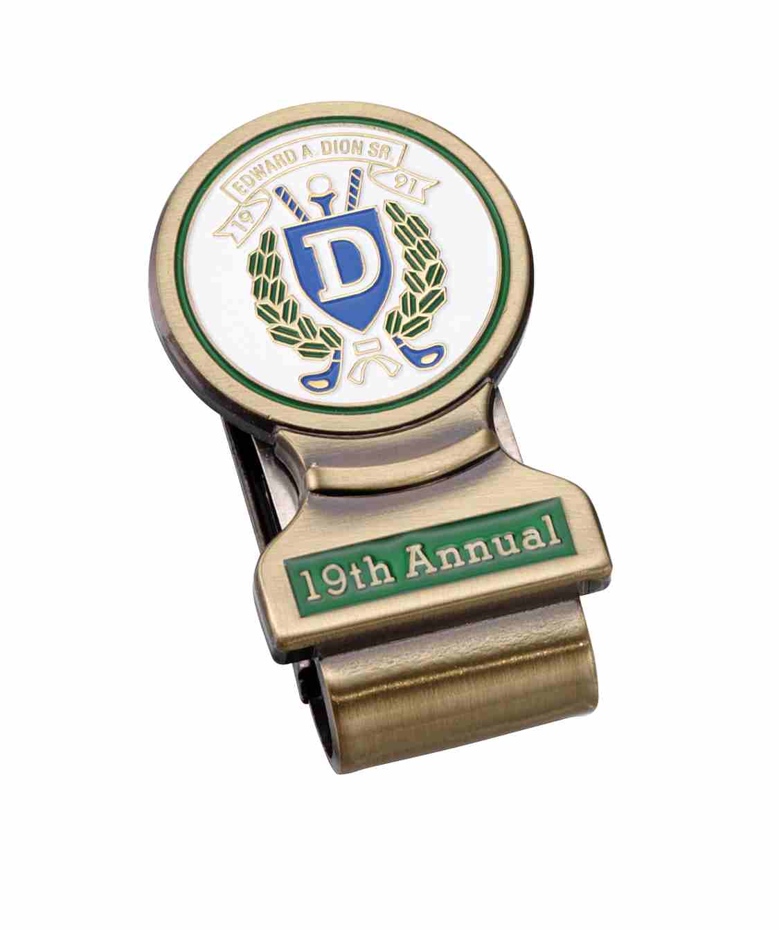 This unique "clip" is actually a hat clip with detachable ball marker. A great gift for golf tournament players and sponsors.