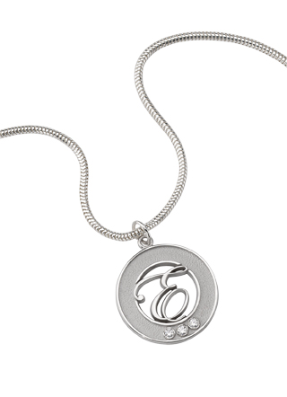 A scripted "E" and three diamonds make up this elegant custom silver pendant for Tupperware. The E symbolizes the Chairman's Elite status of Tupperware demonstrators.