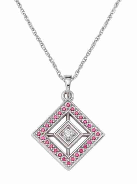Pink garnets and a center white diamond make this custom classic geometric shaped necklace pendant sparkle. Different colored stone colors can indicate multiple career ranks or years of service achieved.