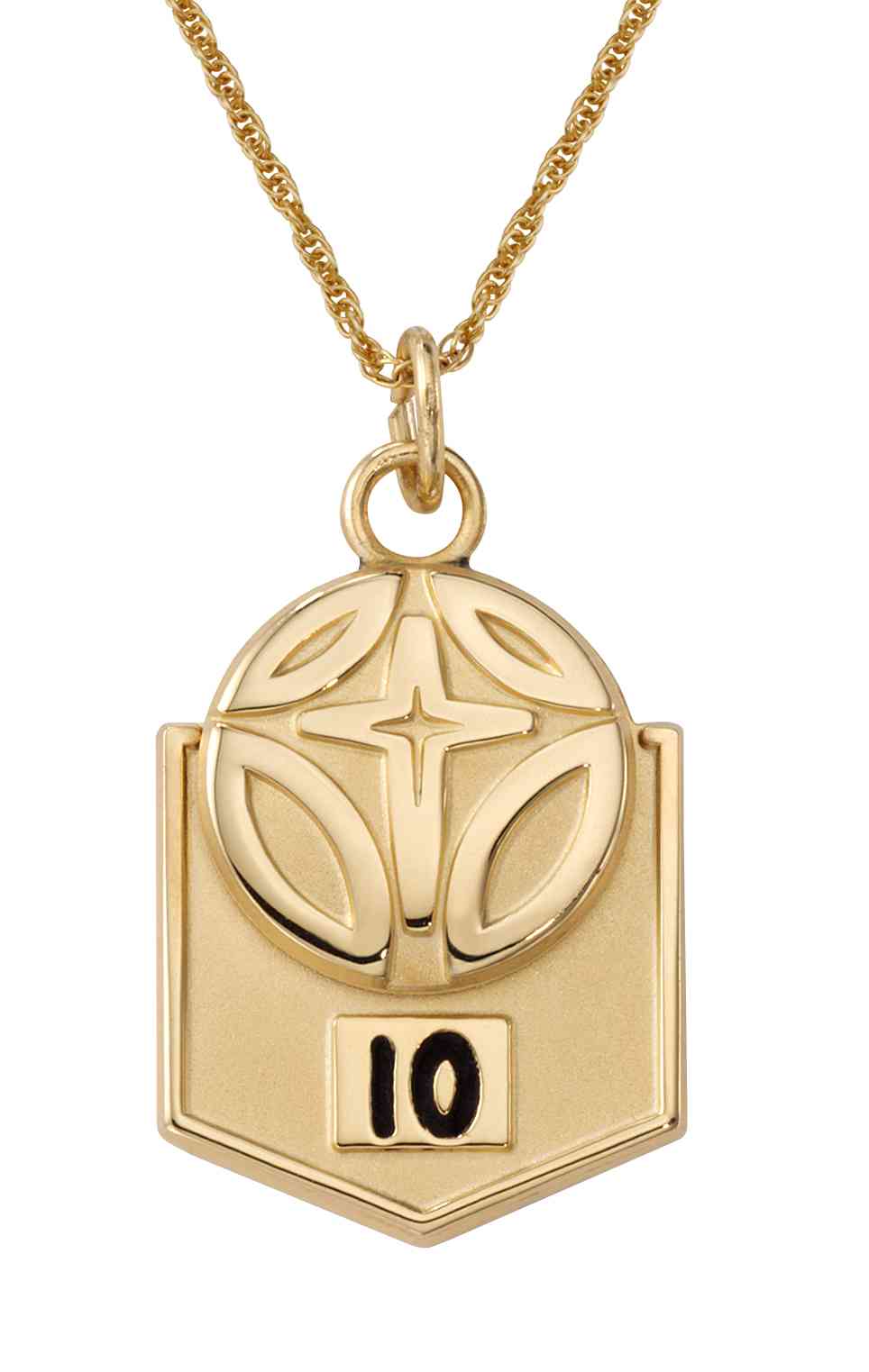 This custom gold necklace pendant recognizes hospital employees for their years of service achievements. Each necklace is engraved with the applicable years of service they have reached.
