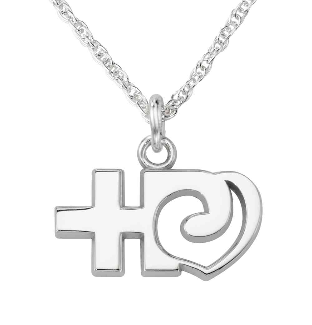 A heart is artfully incorporated into this hospital logo design on this custom high polished sterling silver necklace pendant. A part of the hospitals employee years of service award program.