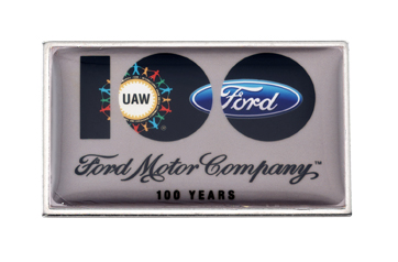 Ford celebrated their centennial anniversary with this custom commemorative pin. The dynamic design features the Ford and UAW logos peaking through a "100" shaped window.