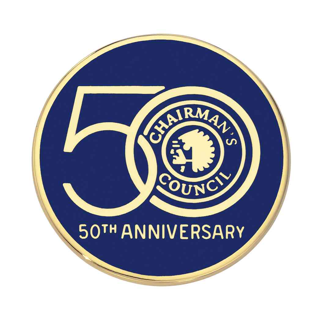 This gold plated brass pin sports the 50th anniversary design for the Chairman's Council. The circular shape of the pin complements the logo nicely