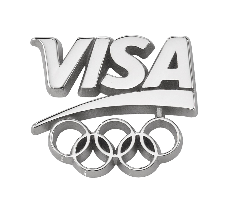 The Olympic rings hang below the Visa logo on this brand awareness pin.