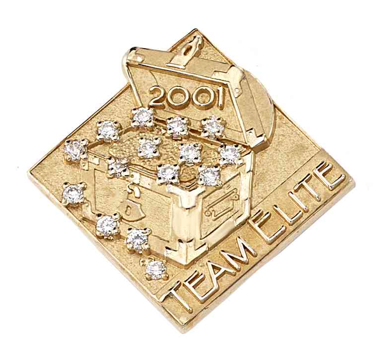 This square pin features a treasure chest overflowing with diamonds. The pin is further customized with the year and company name.
