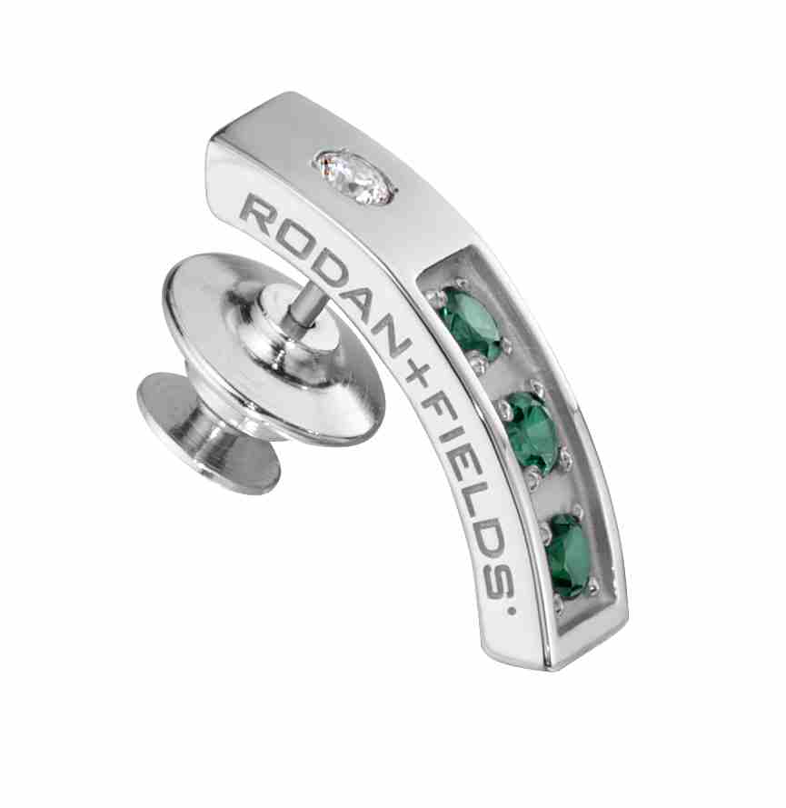 This arched award pin is set with symbolic stones to reflect the recipient's achievements. A diamond is set at the top while three emeralds are set below in a channel. The company's name is engraved on the side.