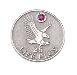 This silver sandblast and polished 25 years of service award lapel pin features the LifePlus bird logo and ruby stone.