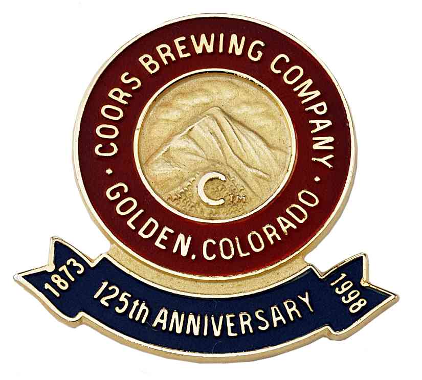 Coors Brewing Company proudly celebrated their 125th corporate anniversary with this gold color filled lapel pin highlighting their iconic Colorado Rocky Mountains