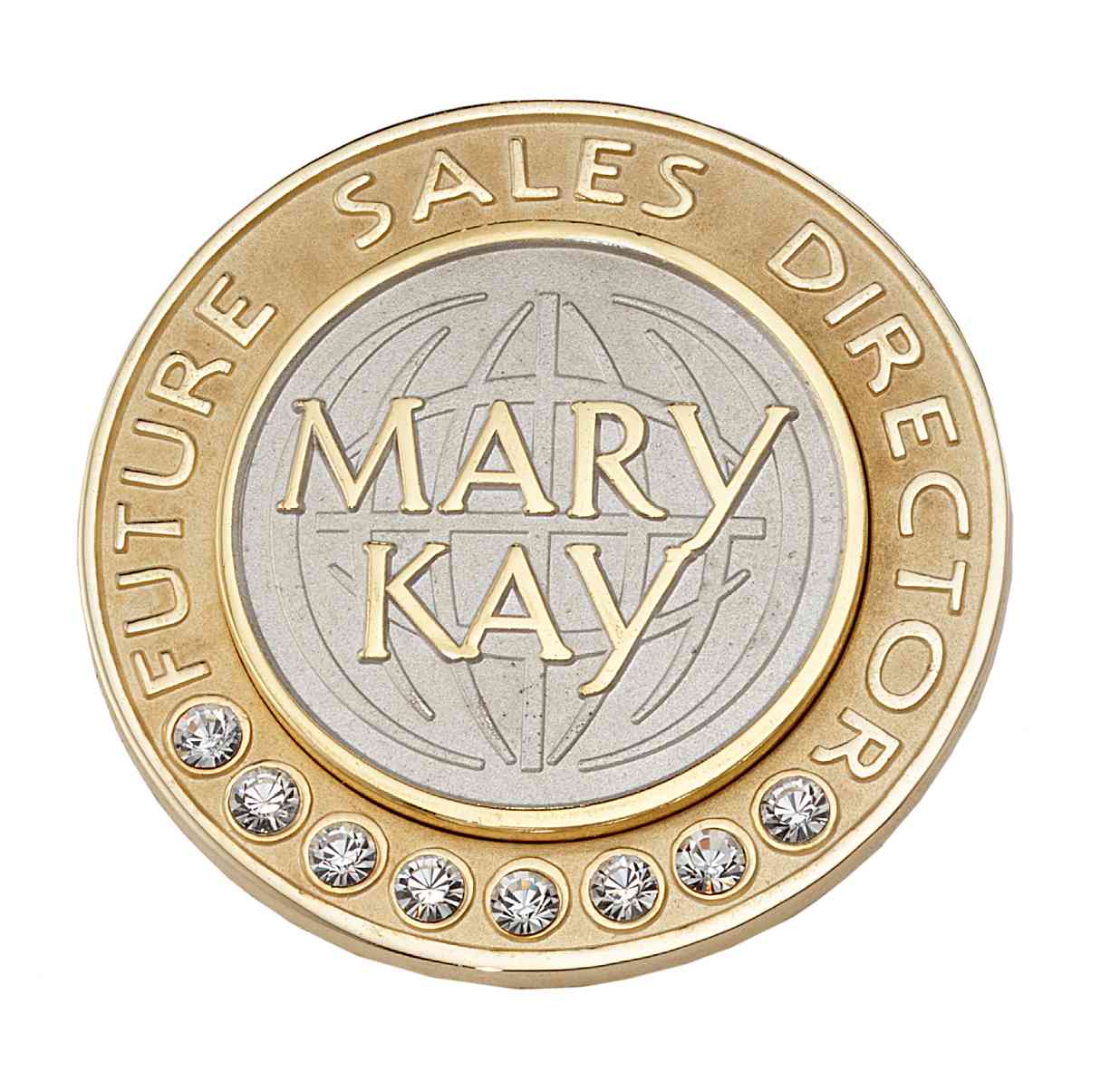 Mary Kay recognizes their consultants' career ranks with this two tone center pin surrounded by a second circular gold "jacket" pin that fits on the back. This "jacket" can be replaced with a new one as consultants move through the ranks.