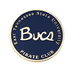 East Tennessee State University recognizes its sports donors with this unique blue and gold lapel pin centered with the Bucs logo and Pirate Club donor designation.
