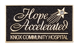 Knox Community Hospital recognizes its donors with this custom gold "Hope Accelerated" lapel pin featuring a stone set diamond.