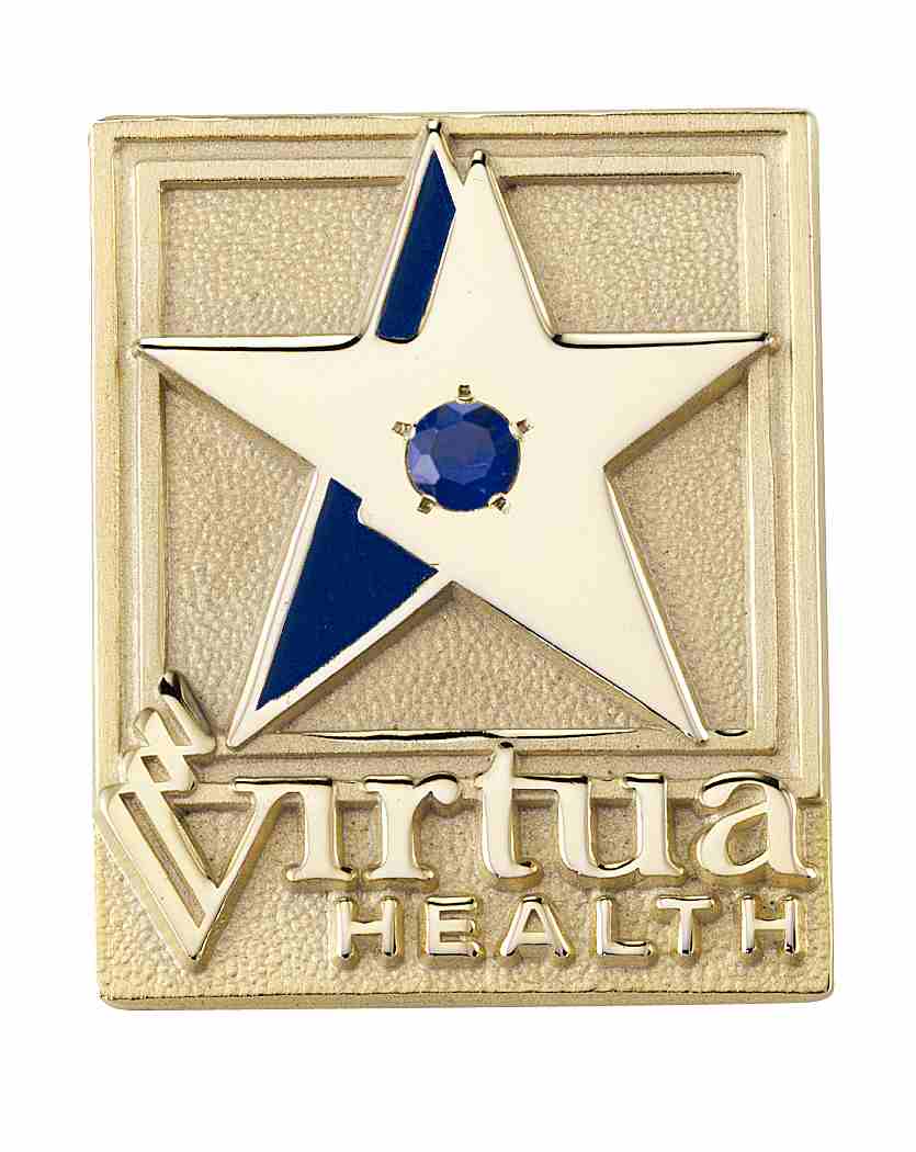 A round sapphire is set in the center of a polished star on this Virtua Health lapel pin.Blue color-fill is used to add extra dimension to the star, and a sand-blasted background helps it to really stand out.