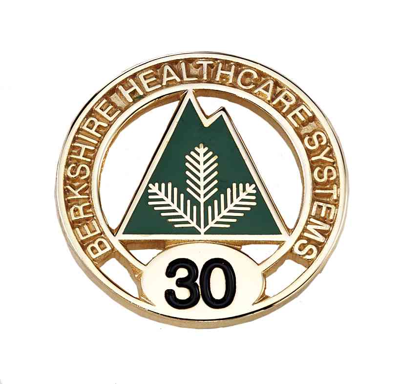 Green color-fill is used to bring the Berkshire Healthcare System's logo to life in this custom length of service lapel pin. The recipient's years of service are highlighted below in black color-fill.