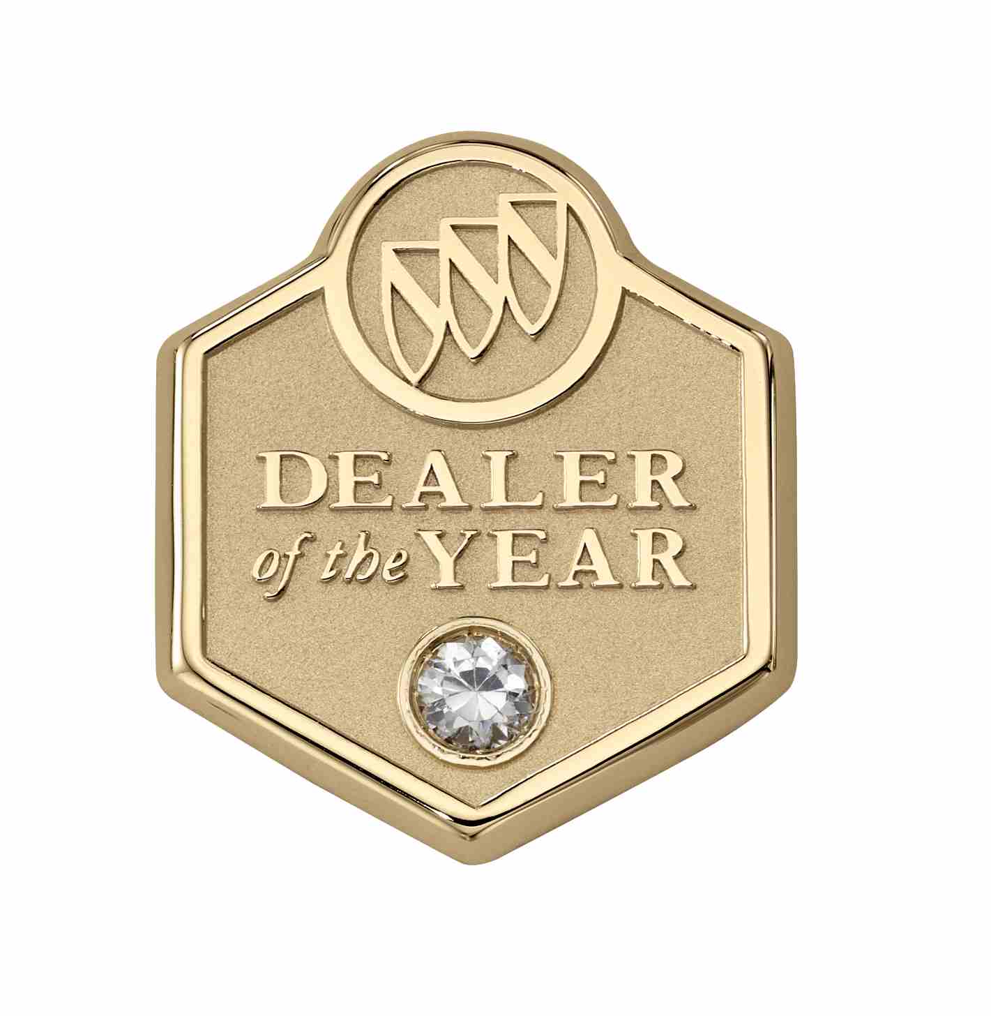 These custom Buick "Dealer of the Year" pins are worn with pride by their recipients. The Buick logo overlaps a hexagonal frame, and a diamond adds a glamorous element.