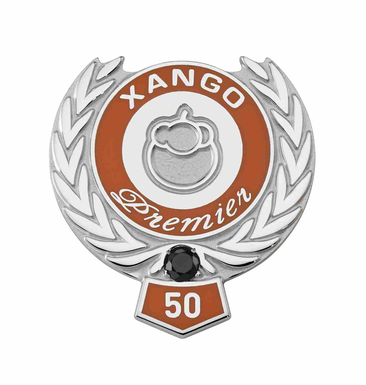 XanGo Juice awarded their top sellers with a series of custom lapel pins. This level features their signature mangosteen fruit in the center, orange color-fill, and a laurel wreath anchored by a black onyx stone. A number banner displays the recipient's achievement at the bottom.