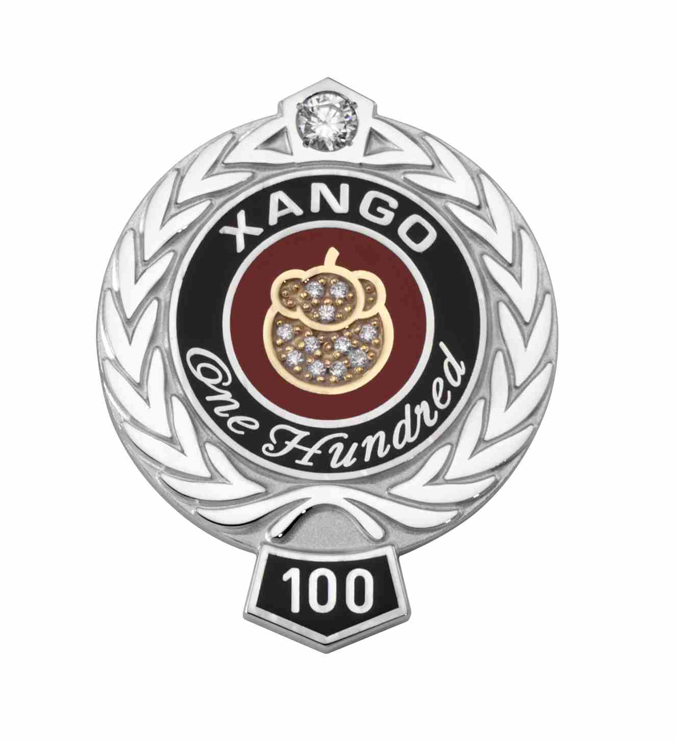 XanGo Juice awarded their top sellers with a series of custom lapel pins. This level features a diamond studded mangosteen fruit in the center, burgundy and black color-fill, and a laurel wreath that completes at the top with a diamond. A number banner displays the recipient's achievement at the bottom.