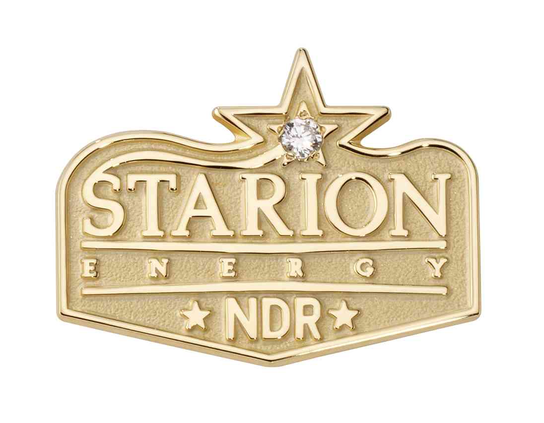 A well-placed diamond lights up the Starion Energy logo on this dignified custom career pin. The recipient's job title initials are located at the bottom and bookended by stars.