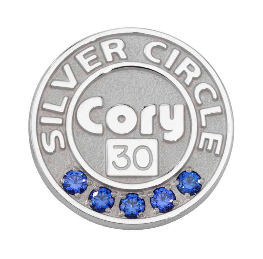 Cory delivery company thanked their employees for loyal years of service with this custom logoed award pin. At 30 years, this pin indicates the recipient has joined the "silver circle," and is rewarded with five stunning sapphires.