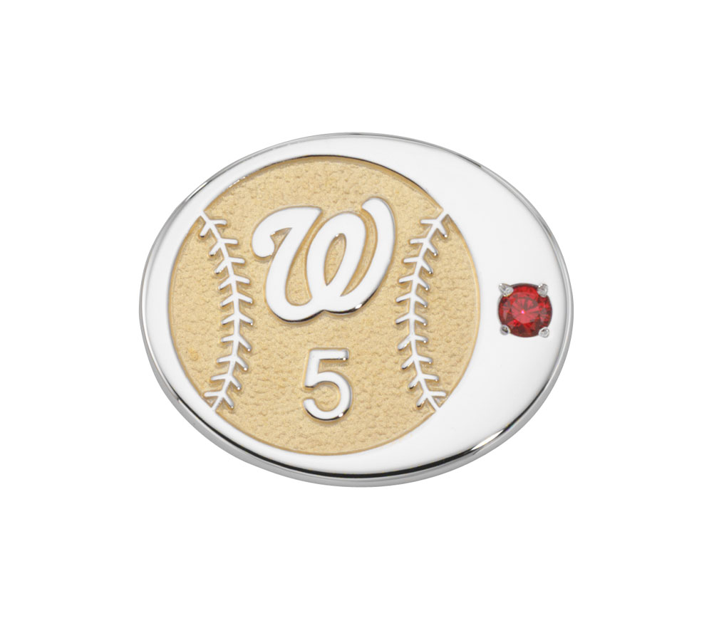 The Washington Nationals thanked their employees for their years of service with a series of custom award lapel pins. The two-tone design allows for the logo to pop, and a ruby adds the team's color.