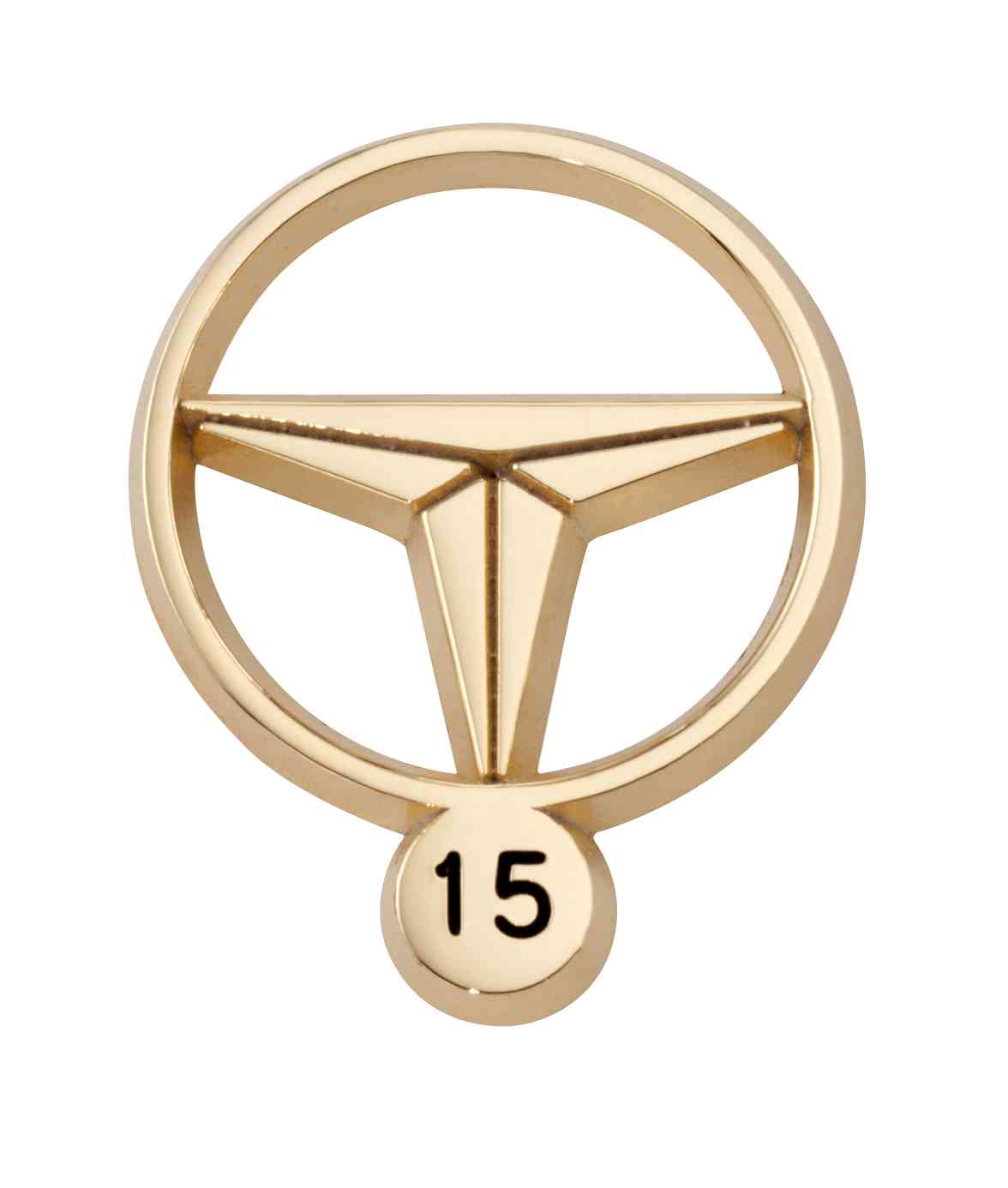 This length of service pin features a circle attached to the company's logo displaying the number of year the recipient has worked there. The number is engraved an colored black for better visibility.
