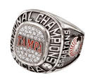 University pride soars when a red "Tampa" is centered in a sea of diamonds on this sterling silver men's championship ring. Silver soccer balls separate the text on top, and the team name and logo are proudly displayed on the side.