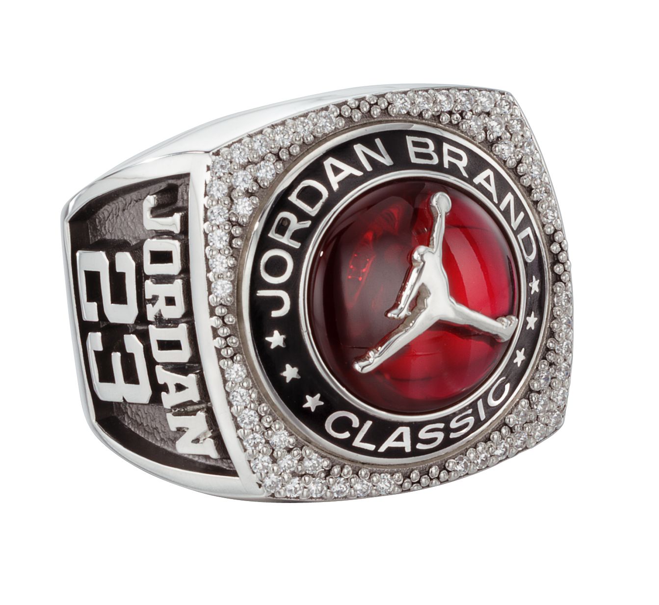 The Jordan Brand Classic logo is brought to life with a silver figure fastened to a round ruby center stone. Diamonds cluster around in an array of sizes to add dazzle to this sterling silver men's championship ring. The recipients name and jersey number are displayed on the side.