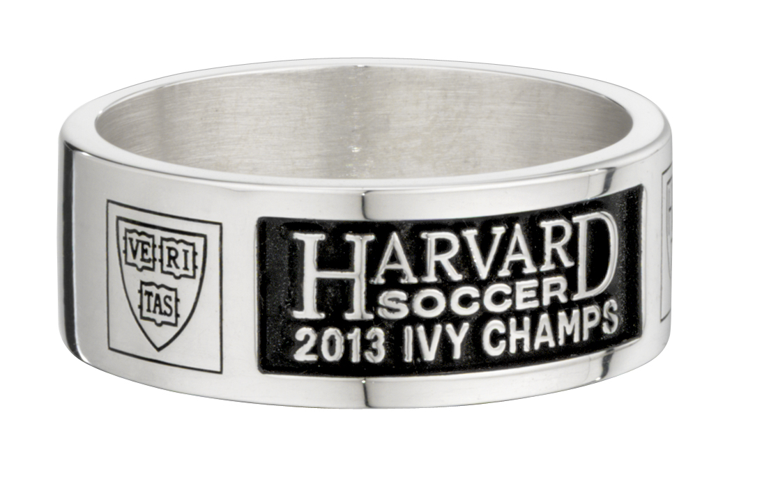 This elegant sterling silver women's championship ring features silvers letting over a black background. The Latin motto crest has been engraved and colored black to stand out against the silver.