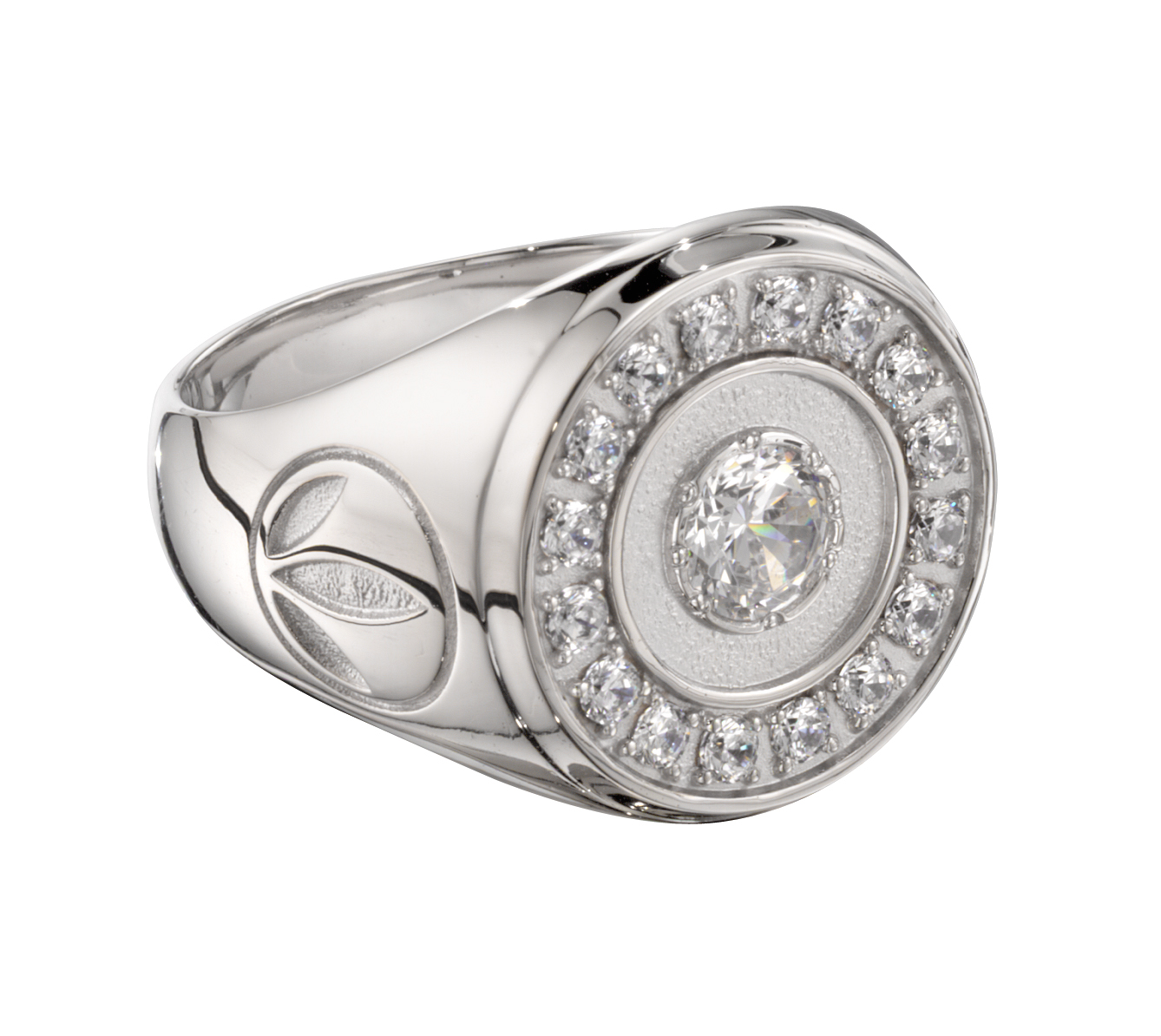 Simplistic sparkling elegance exudes from this sterling silver women's sales award signet ring. A larger, round-cut diamond is set in the center and smaller diamonds create a circle around it. The company logo has been engraved into the side.