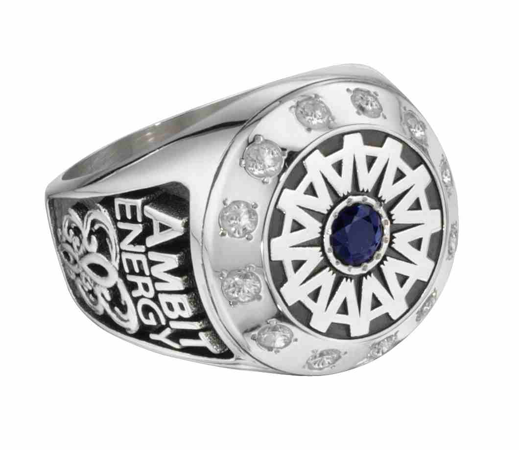 This clever design took the "A" from Ambit Energy and created a silver starburst around a round cut sapphire. This men's sterling silver sales award ring also features a circle of diamonds and the company's logo on the side.