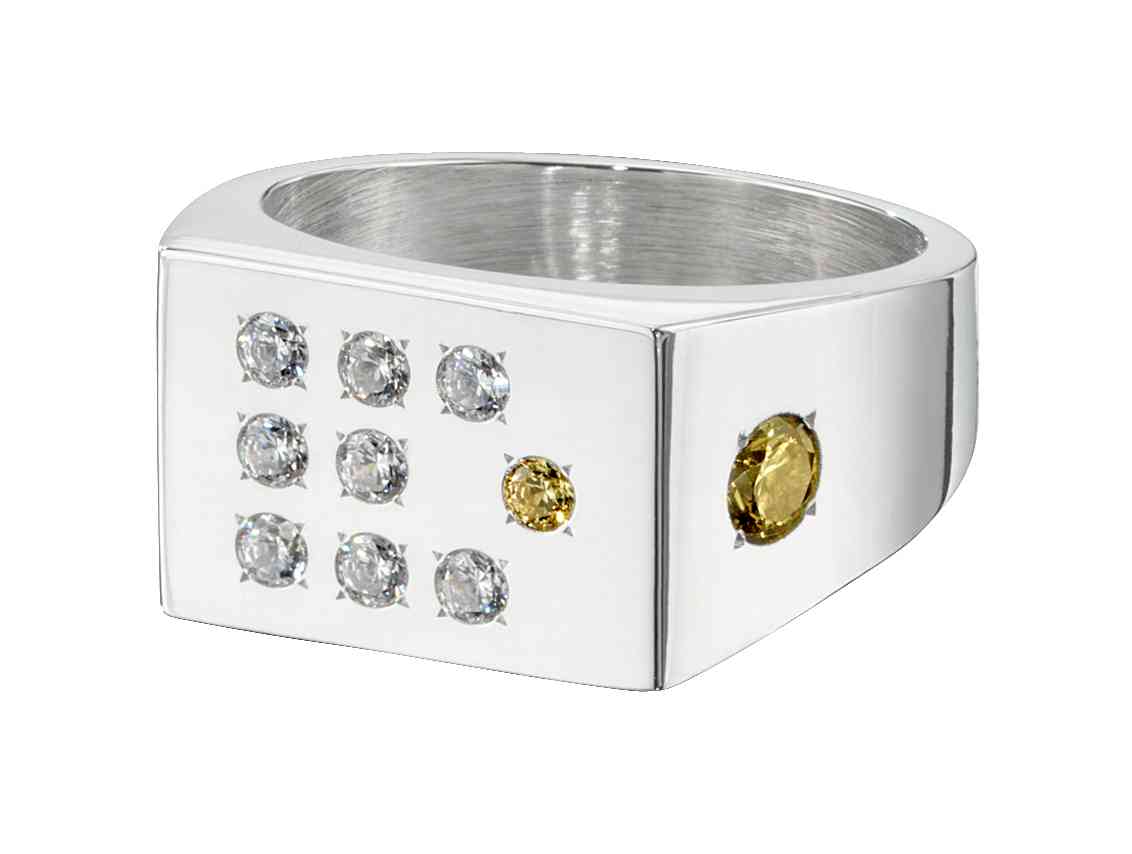 Diamonds and a brown tourmaline stone recreate the company logo on this 10 karat white gold men's signet award ring. Another brown tourmaline stone is set into the side.