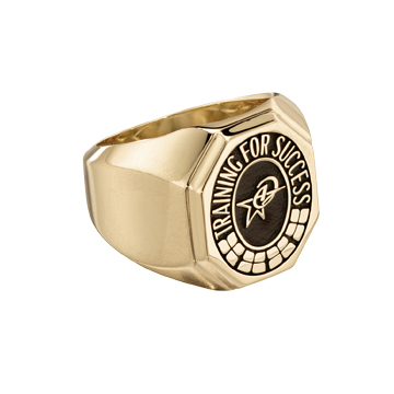 The company logo shines against a black background in this 10 karat gold men's sales award signet ring. An octagonal shaped bezel and creased band adds a sophisticated design element.
