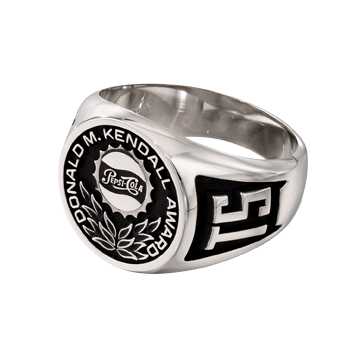The company logo shines on a miniature bottle cap in this 10 karat white gold men's signet sales award ring. Underneath the logo is a laurel wreath, and the recipient's initials are proudly cast into the side of the ring.