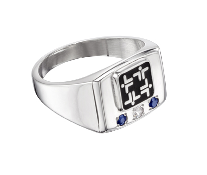 This company's logo lifts off this sterling silver ring and pops against a black background. Alternating sapphires and a diamond underscore the logo on this women's signet sales award ring.