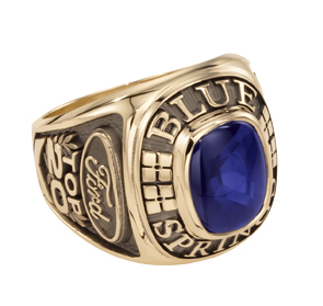 Company colors shine with a sapphire center stone in this classic 10 karat gold men's sales award ring. The company's logo is proudly featured on the side.