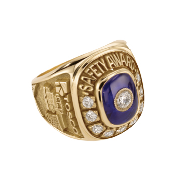 A stunning diamond is set inside a sapphire center stone in this 14 karat gold men's safety award ring.More diamonds add sparkle around the edge of the bezel. The company logo is cast into the side of the ring.