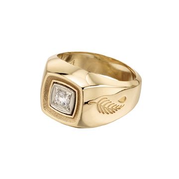 Intricate metal detailing gives this gold ring an elevated simplicity. A single diamond sparkles in the center, while custom logo engraving adorns the sides of this sleek ring.